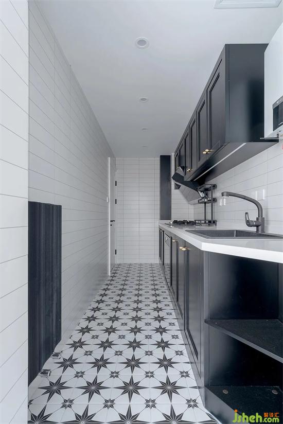 廚房選用了深色的柜體,黃銅把手與深顏色的柜體相得益彰。廚房頂面用了防水石膏板和筒燈的結(jié)合,柜體內(nèi)嵌洗碗機(jī),裝修徹底解除洗碗的煩惱,200*200的花磚,讓復(fù)古中帶有幾分俏皮。