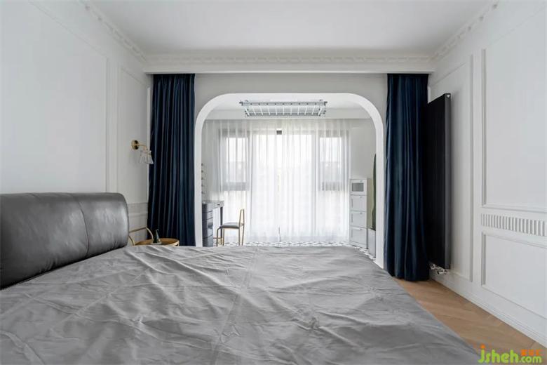 臥室陽臺(tái)采用了可升降的晾衣架,方便晾曬,復(fù)古的深藍(lán)色給臥室增添了幾分神秘感。