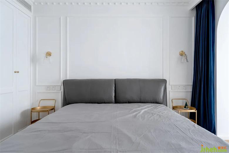 床頭旁選用了可靈活推拉的盤式儲(chǔ)物,拉絲黃銅的質(zhì)感+深藍(lán)色的窗簾組合高級(jí)感十足。