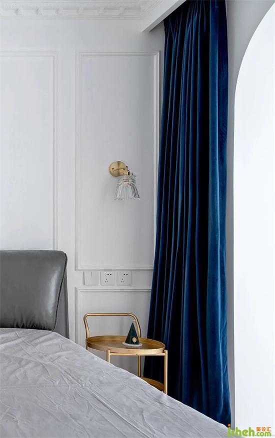 床頭一角,裝修選用了復(fù)古的深藍(lán)色絲絨質(zhì)感窗簾,手感絲滑,如大海一般神秘沁人心脾。