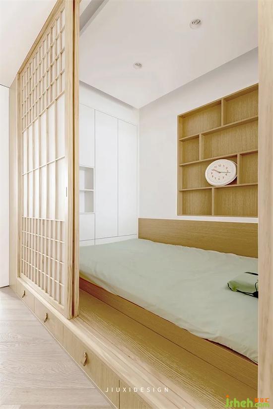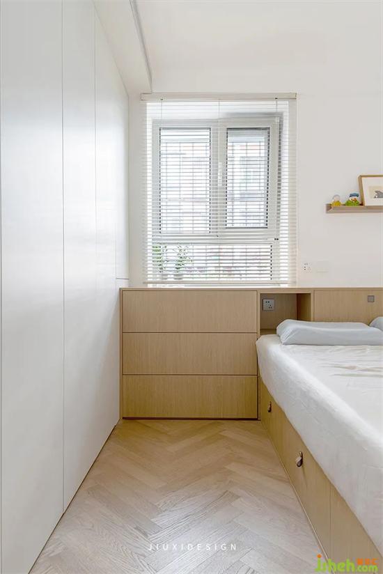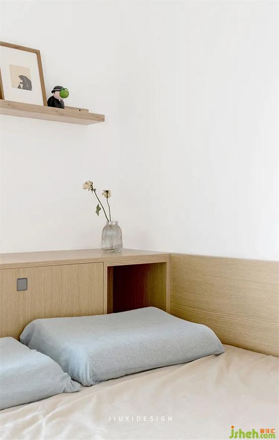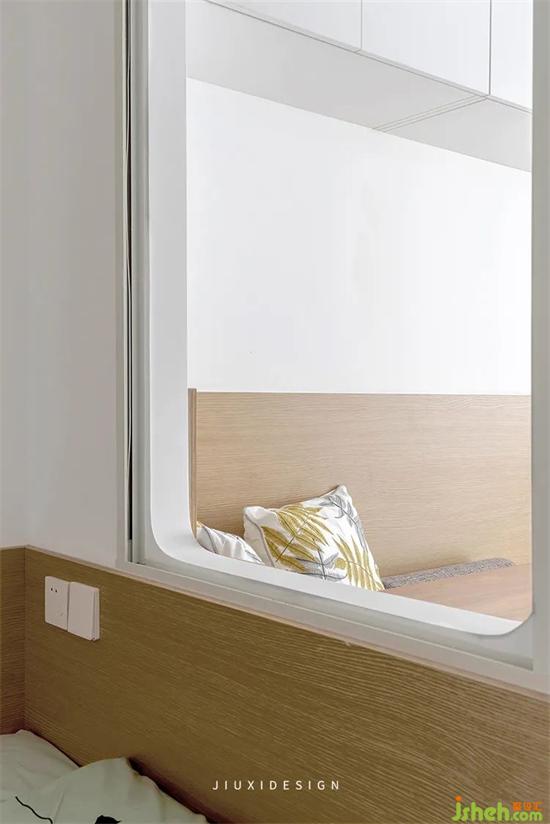 臥室的床頭做成一組柜子,裝修設計具備收納,也加寬了窗臺,有一種飄窗的感覺。