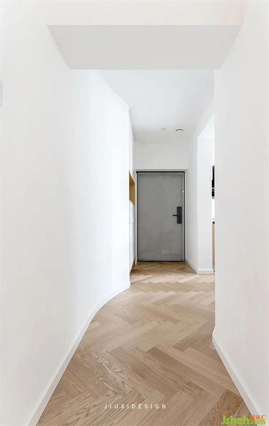 弧形墻體擋住了鞋柜的側面,裝修設計利用這個優(yōu)點,完美的嵌入了一面超薄鞋柜,解決了原來入戶沒有鞋柜的窘境。