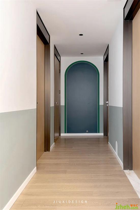 過道區(qū)域延續(xù)了客餐廳的分色墻,裝修設(shè)計在視覺中心處做了想象空間,那里有一扇任意門,可以穿梭在空間與時間中。