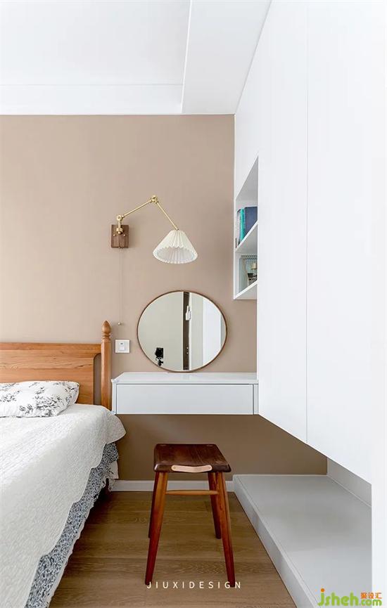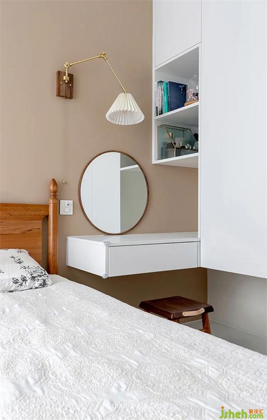 衣柜和梳妝臺一體化的設(shè)計干凈整潔,墻面的壁燈不僅作為床頭燈的使用,裝修設(shè)計還可以作為梳妝燈。小巧的壁燈也為臥室空間帶來精致,充滿個性的視覺趣味。