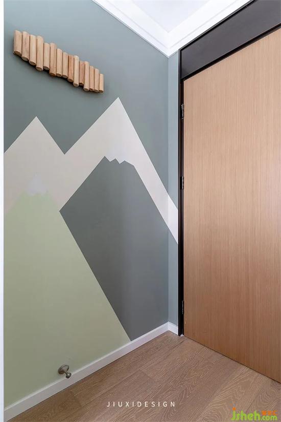 兒童房選擇了溫和的綠色系,門后的墻漆刷成了一組組小山的造型,裝修設(shè)計使整個空間充滿了童趣感。