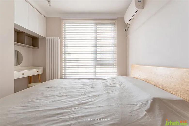 在臥室劃出一個(gè)衣帽間,來(lái)增加整體臥房的儲(chǔ)物。原木床體與外部的木色有了呼應(yīng),裝修讓家變得統(tǒng)一舒適。