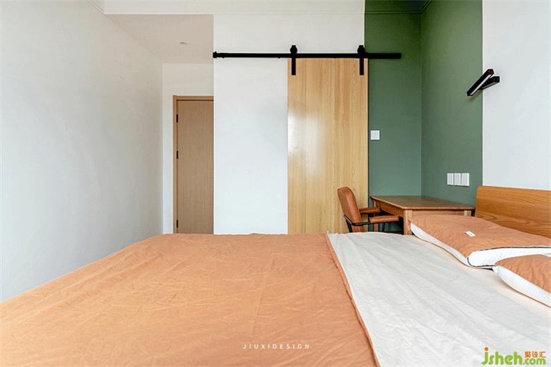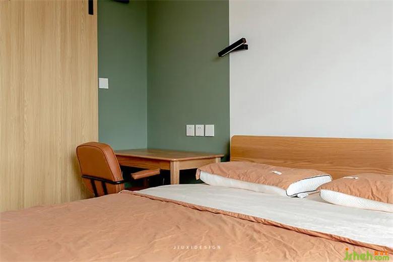 由于屋主有在家偶爾室內(nèi)設(shè)計(jì)師辦公的需求,在床頭增加了辦公區(qū),床品和椅子的配色,統(tǒng)一空間色調(diào),擁有變化還不失單調(diào)。