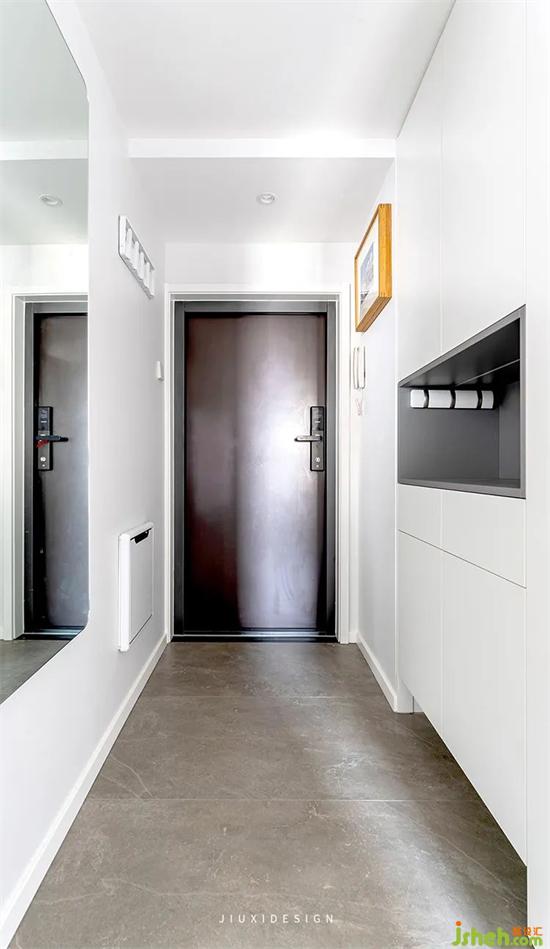 入戶的位置規(guī)劃了換鞋凳,掛衣區(qū),鏡子和鞋柜位置。鞋柜區(qū)域預(yù)留了開放格和抽屜,放置小件物品,同時(shí)也可以處理不用扔掉的口罩。室內(nèi)設(shè)計(jì)整體色調(diào)通過明朗色塊的墻頂和地分開,形成明暗變化。走進(jìn)入戶空間的第一感,一種簡(jiǎn)約舒適感迎面而來。