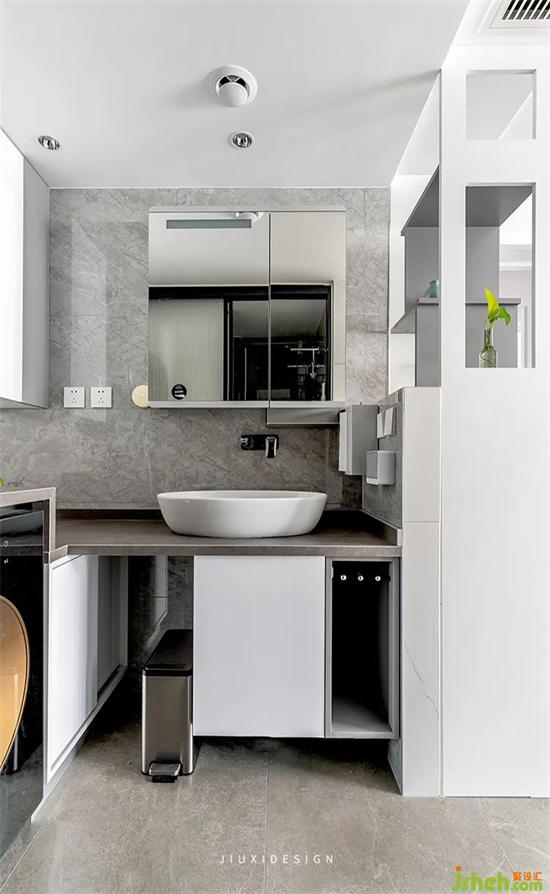 這里是衛(wèi)生間干區(qū)的區(qū)域,也是放置洗衣機的家政區(qū)空間。洗烘一體機內嵌,熨燙區(qū)域預留,壁掛洗衣機藏起所有管線,室內設計都在詮釋簡潔的氛圍。素雅清新的色調,兼顧空間功能與收納,在步入空間的同時,擁有利落優(yōu)雅的感覺。