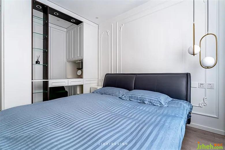 不對稱的床頭造型墻,裝修設(shè)計(jì)打破固有的單一性,還能釋放床體兩側(cè)過道的空間感。
