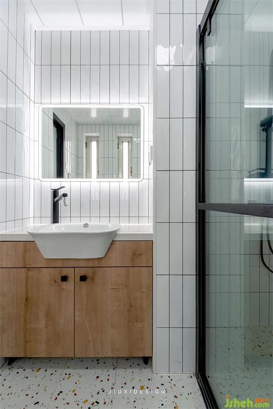 客衛(wèi)同樣做了干濕分離,浴室柜臺中盆的設(shè)計,室內(nèi)裝修解決了深度尺寸太小的問題。豎向鋪貼長條小白磚,起到給小空間延伸高度的效果。壁龕滿足了淋浴區(qū)域,對洗漱用品收納。