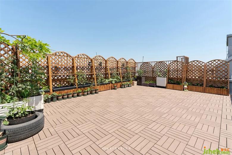 露臺地面整體鋪設(shè)了室外專用塑木地板,方便打理。露臺外側(cè),用原木花架所包圍,美觀又安全。隨處安放的綠植和蔬菜,有一種回歸田園的味道,當然這也是戶外燒烤的絕佳之地。