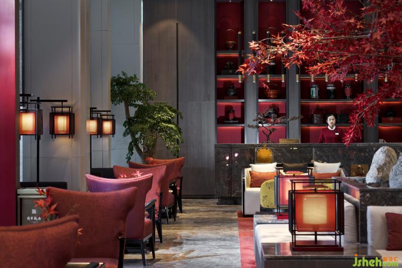 異曲同工的天花設(shè)計(jì)還出現(xiàn)在簽約區(qū),挑高的設(shè)計(jì)、濃妝淡抹的色澤以及對(duì)稱的空間布局,如行云流水般的姿態(tài),描繪出東方極韻。