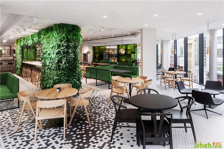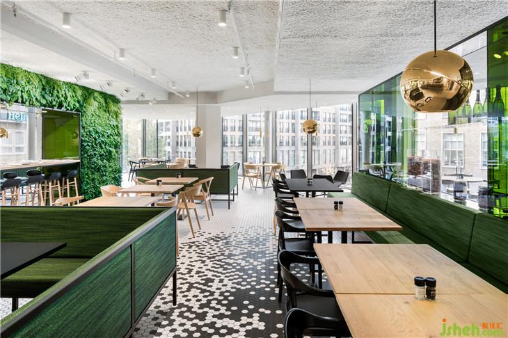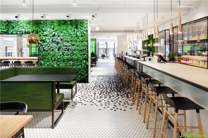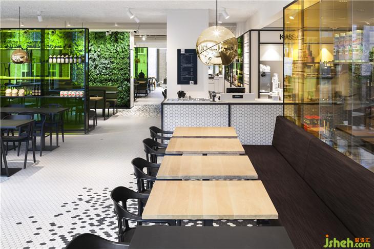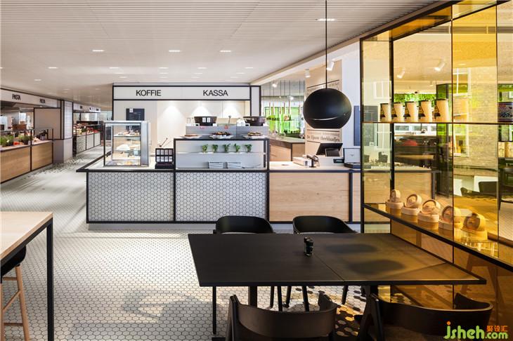 靈感來自于公司名稱De Bijenkorf (beehive),它的六邊形標志指的是一個蜂巢,i29設計了一個生動的黑色六邊形瓷磚圖案,接縫“聚集”在輕地板、酒吧和柜臺前面。
