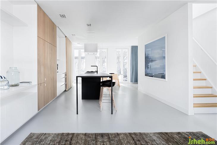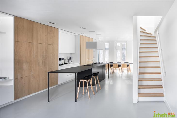 包括櫥柜,電視柜和專門設(shè)計(jì)的廚房,都可以可以通過大型橡木墻完全隔離。 一個(gè)對(duì)比鮮明的黑色廚房被放置在這個(gè)空間的中心。