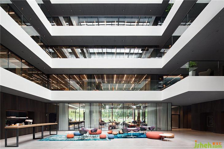 進(jìn)入大樓,來(lái)訪的客人會(huì)發(fā)現(xiàn),這里遠(yuǎn)不止一個(gè)開(kāi)放的辦公空間。AEB一直以來(lái)非常注重工作上同事之間的溝通與交流,為能夠在設(shè)計(jì)中體現(xiàn)這種企業(yè)文化,我們盡量擴(kuò)大了視覺(jué)空間感,從而讓不同功能空間互相具有連貫性。從前臺(tái),目光經(jīng)過(guò)中心休息區(qū),繞過(guò)一片玻璃隔斷進(jìn)入接近大堂的員工食堂。每一層靠近中庭的陽(yáng)臺(tái)互相錯(cuò)落,賦予了強(qiáng)烈的層次感。這些公共陽(yáng)臺(tái)為員工提供著休閑討論區(qū),無(wú)框玻璃和玻璃欄桿柔和地沿著走廊伸延,讓員工和客人更好地欣賞中庭和室外的景象。開(kāi)放式的中庭設(shè)計(jì)使得多種多樣的功能區(qū)域在視覺(jué)上融為一體,訪客可從第一層的大堂看到第四層的辦公空間。這種設(shè)計(jì)方式充分地體現(xiàn)了AEB的文化,無(wú)論是團(tuán)隊(duì)辦公室還是研討會(huì)議室,都讓這里的員工能夠更加專(zhuān)注地進(jìn)行工作,同時(shí)交流也更加放松、快捷。