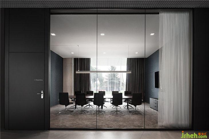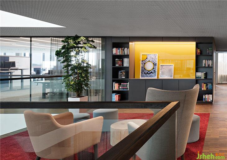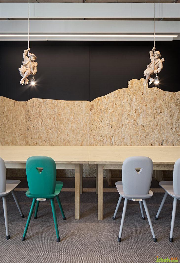 AEB總部每一層都有一個(gè)主題房間,這些可用于進(jìn)行大型會(huì)議或進(jìn)行更為深入的團(tuán)隊(duì)工作。吧臺(tái)椅放置在松軟的地毯上,與落地?zé)艉托还裣嘟Y(jié)合,讓這間會(huì)議室轉(zhuǎn)變成‘思想起居室’。會(huì)議室中紅色的大象雕塑看似突兀,但它鼓勵(lì)參與者可以發(fā)揮充分地創(chuàng)意和想象。四層角落的長(zhǎng)椅和復(fù)古風(fēng)格的椅子等傳統(tǒng)家具在簡(jiǎn)約又現(xiàn)代的裝修環(huán)境中創(chuàng)造了一個(gè)樸實(shí)但并不保守的工作氛圍。一個(gè)大型工作臺(tái)和裝飾吊頂與獨(dú)特設(shè)計(jì)的吊燈相結(jié)合,讓冰冷的會(huì)議室變成一個(gè)活躍的靈感源泉。旁邊的‘?dāng)?shù)字化實(shí)驗(yàn)室’則是為科技愛(ài)好者提供的用來(lái)測(cè)試領(lǐng)先技術(shù)、進(jìn)行研究、3D打印以及展示VR技術(shù)的場(chǎng)所。