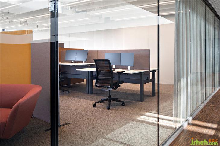 雖然所有員工的工作空間都是開(kāi)放的,但他們?cè)谝鹿穸紦碛歇?dú)立的儲(chǔ)物箱可以放置個(gè)人物品。AEB的員工也可以根據(jù)個(gè)人喜好選擇不同工作區(qū)域:可調(diào)高度的工作臺(tái)、站立式工作臺(tái)以及可放置多臺(tái)電腦的常規(guī)辦公臺(tái)面。大型辦公室中的壁龕提供更私密的角落,幫助營(yíng)造一個(gè)舒適的氛圍。斜對(duì)角的A和B辦公室被分配了黃色和藍(lán)色的主色調(diào),以便員工更快、更準(zhǔn)確地找到方向。