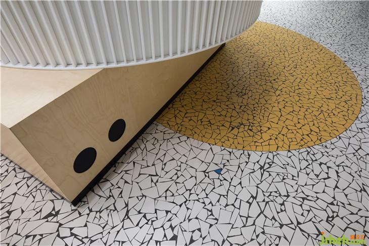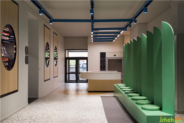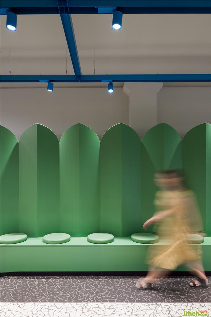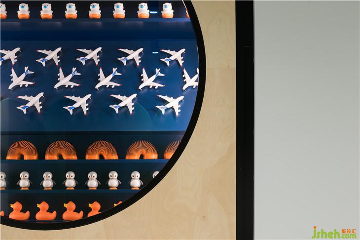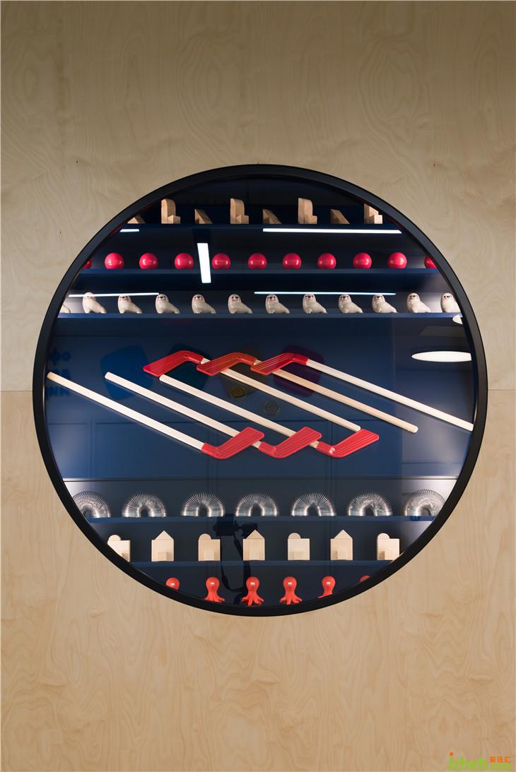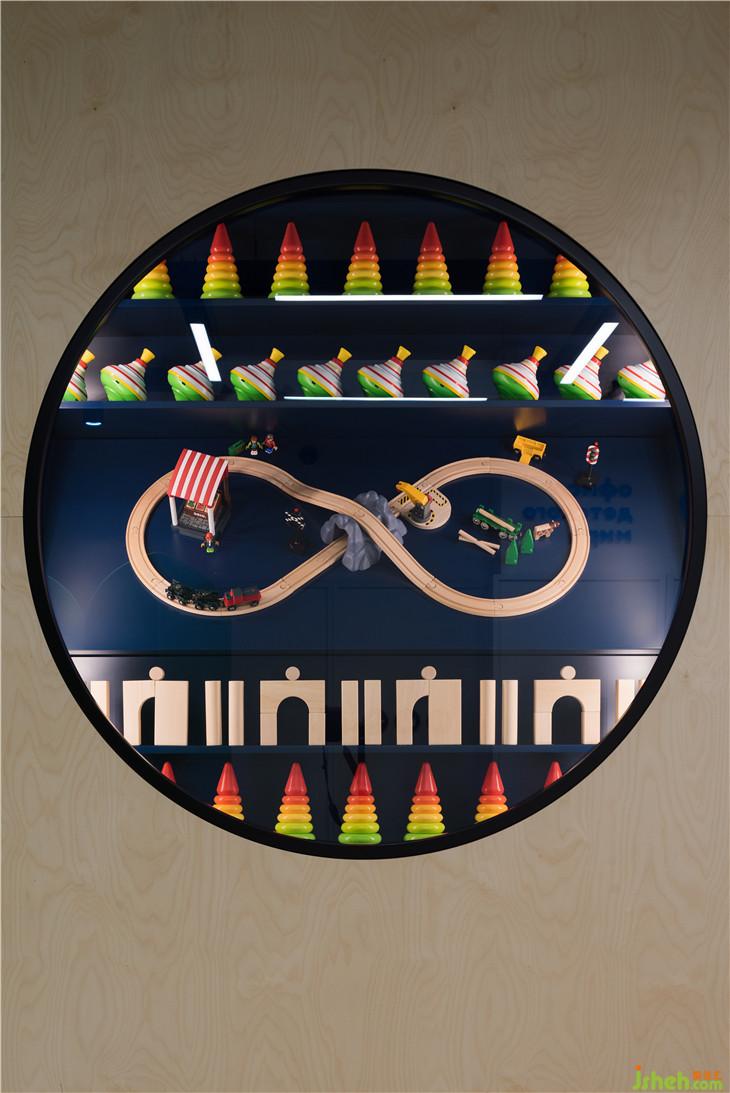 入口處墻面上的圓形展示窗口陳列著各式經(jīng)典玩具,喚起人們熟悉的記憶,同時標(biāo)識著棋盤游戲的開始。