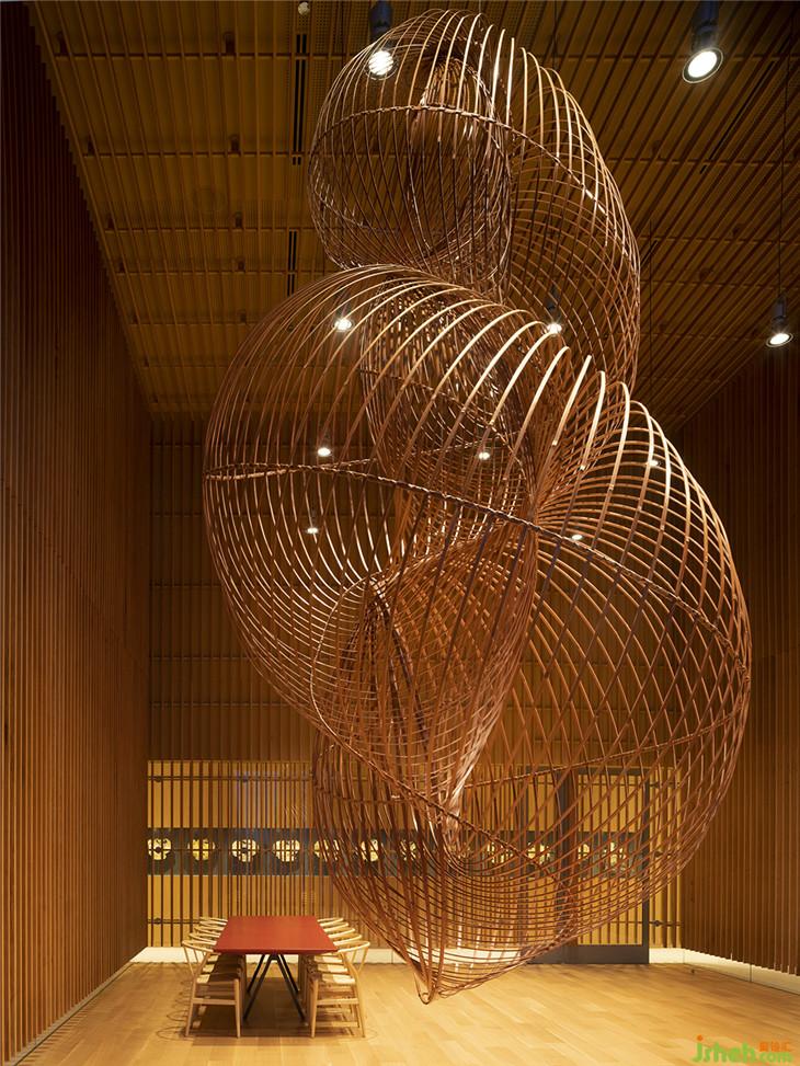 該空間由日本藝術(shù)家上野正雄(Ueno Masao)的竹制懸空雕塑和清水純子(Junko Kirimoto)設(shè)計(jì)的日本漆面桌子組成。這個(gè)空間有一種東方的感覺(jué),巧妙地衡量了比例,符合賦予Kirimoto工作室活力的意大利和日本情感。
