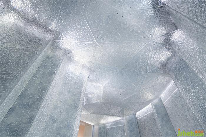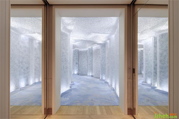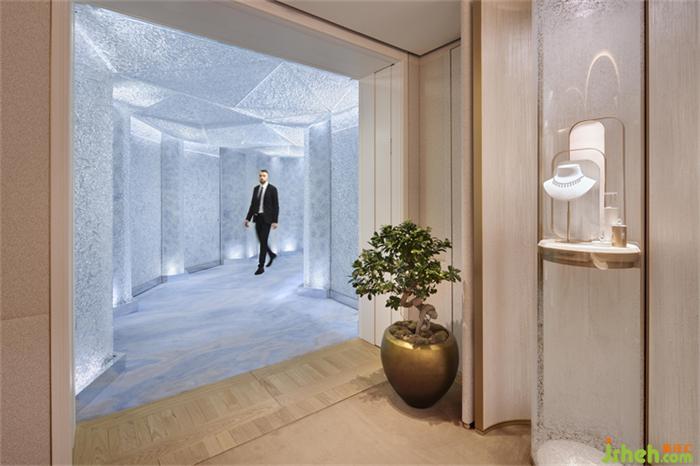精品店的入口被水晶玻璃制作而成的冰墻所覆蓋,猶如踏入一座冰封千年的童話王國,卡地亞精品店設(shè)計不規(guī)則的天花板和墻板渾然一體,像穿梭在冰川中,凌烈卻變幻莫測。