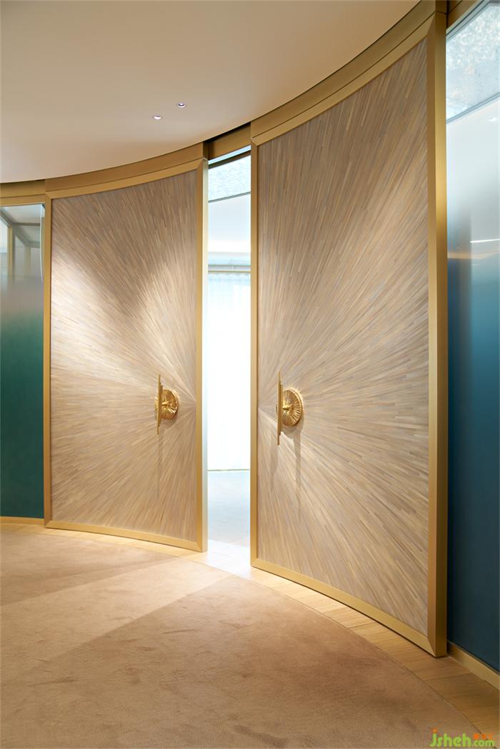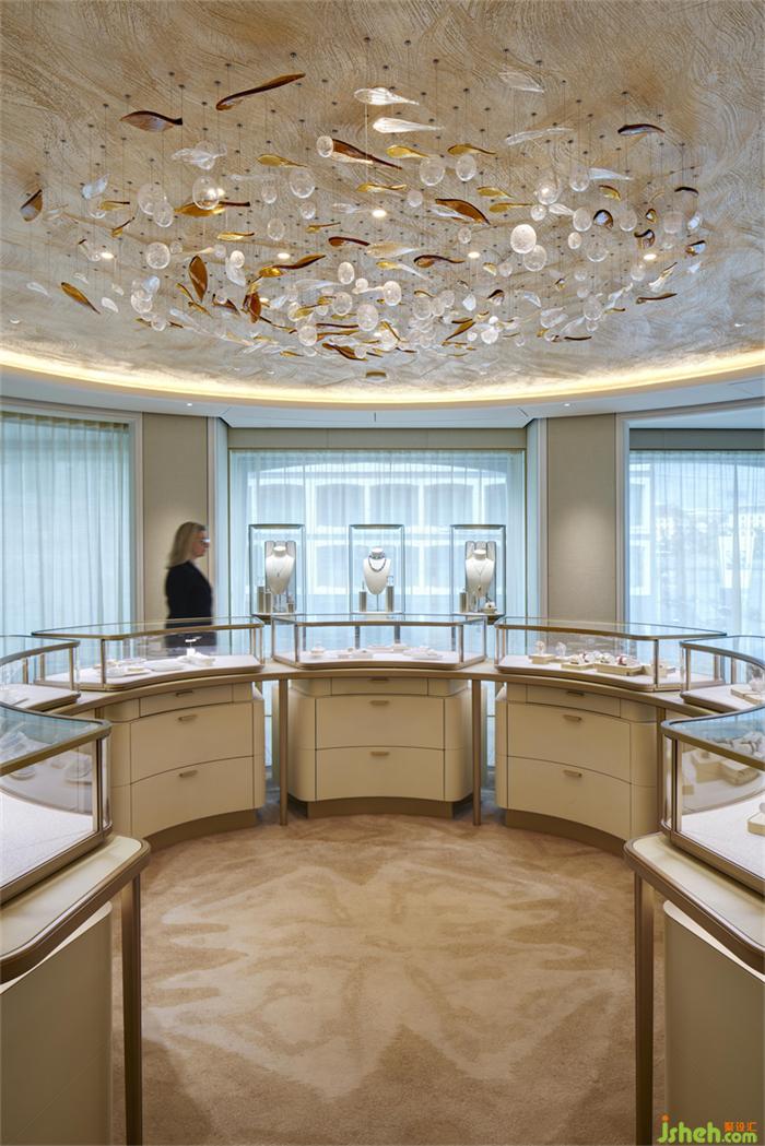 卡地亞精品店設(shè)計師通過幾組不同的藝術(shù)吊燈,將室內(nèi)空間進(jìn)行了無形的切割,圓形的展示柜方便客戶近距離觀察珠寶首飾。VIP客戶休息區(qū)利用夾絲玻璃作為隔斷,即保護(hù)了隱私,又讓空間有效流動,內(nèi)外溝通。