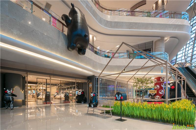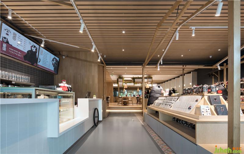 在餐廳的入口處,我們不僅把可愛神秘的“熊印”作為導(dǎo)視設(shè)計的創(chuàng)意元素,將好奇的客人從商場公共區(qū)域引入餐廳外擺區(qū)和游戲區(qū)。更是將熊本城的剪影轉(zhuǎn)化為品牌符號,與主題雕塑一起,完整的傳達(dá)了熊本縣的歷史文化。店內(nèi)設(shè)置了很多開放性場景:例如麥田環(huán)繞的室外用餐區(qū)和游戲區(qū)、開放式的售賣區(qū)、開放式的蛋糕飲料區(qū)、開放式的大廚房、用象形抽象化之后的帳篷、鳥居、日式大排檔等元素來引入最具煙火氣息的小鎮(zhèn)場景,以及所求不多、簡單明了,原生態(tài)而富有人情味的市集風(fēng)貌。室內(nèi)的櫻花樹讓人模糊了室內(nèi)與室外的界限,而餐廳室外區(qū)域的麥田又讓人的感官從室外投射到了更廣闊的原野。相信這樣的原創(chuàng)設(shè)計將成為吸引客流的熱點,人們通過社交媒體的傳播和口碑分享,將會把這份快樂和美好再次傳播出去。