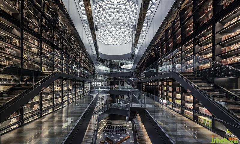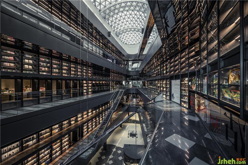 一樓到四樓,南面延伸至北面,在漫灑的天光映襯下,巨匯設(shè)計(jì)置入了兩道量體書(shū)墻,層高18米、全長(zhǎng)240米的尺度為全中國(guó)之最,使喧鬧的商業(yè)空間卻有著殿堂般儀式性的感動(dòng)與震撼。