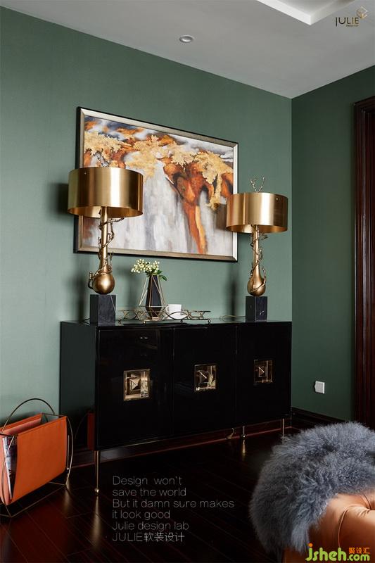 室內(nèi)設(shè)計(jì)師在個(gè)性的墨綠鍍金墻紙依附于深棕色裝飾木作上,