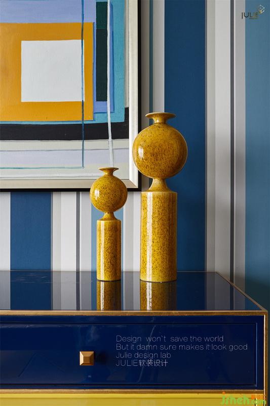 空間的冷色調(diào)則通過各類黃奶色裝飾擺件來(lái)進(jìn)行調(diào)解,