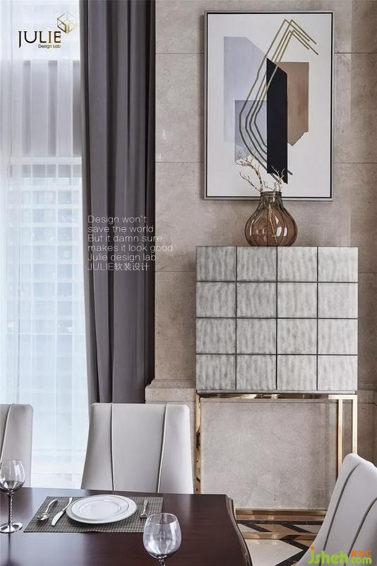 灰色系做大面積的渲染,不同飽和度灰層層圍繞,仿佛薄霧彌漫,兩端對稱的高角柜造型獨特別致,搭配軟裝小配飾,又能起到畫龍點睛的效果。