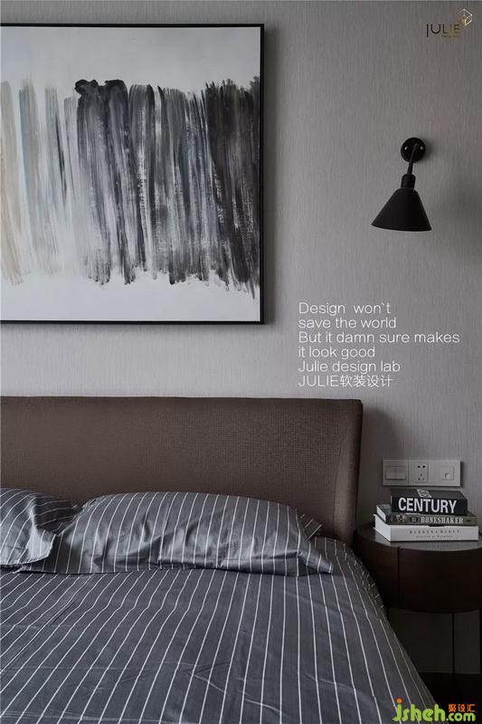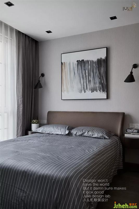 小空間無需過多的裝飾,魅影黑室內(nèi)設(shè)計(jì)師用于燈罩與灰色相互協(xié)調(diào),裝飾掛畫既可以增加空間的色彩感,又可以提高整體的視覺溫度。