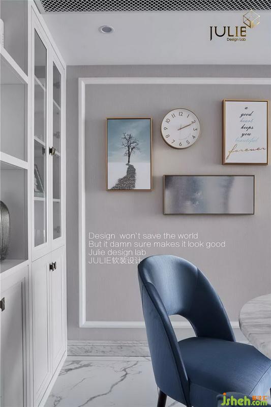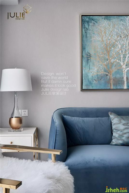 不同于大多數(shù)美式風(fēng)格喜歡淺色系的布藝沙發(fā),室內(nèi)設(shè)計(jì)師選擇了含蓄內(nèi)斂的夢(mèng)幻藍(lán)色絨面沙發(fā),彰顯了居家者低調(diào)卻不失品味的特點(diǎn)。