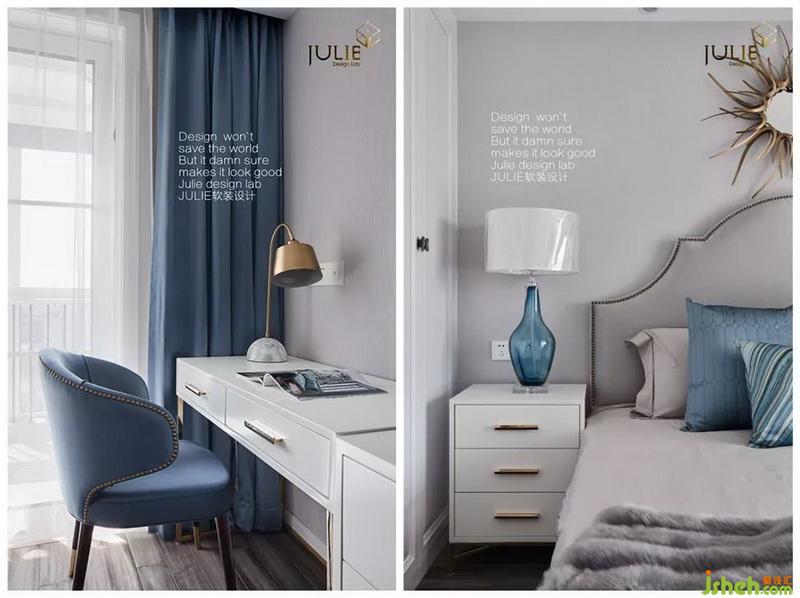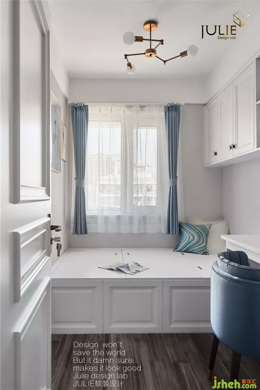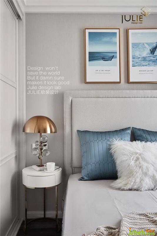 簡(jiǎn)約的布藝床背,融合空間整體大色系,輕巧時(shí)尚的玻璃球?yàn)樾】臻g增添些許層次。