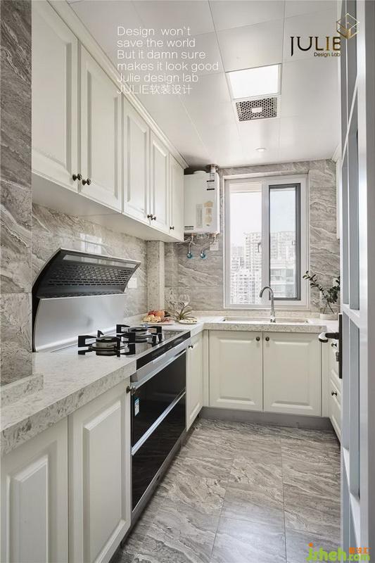 流水狀瓷磚整體統(tǒng)一,搭配淺色櫥柜整體效果簡(jiǎn)約大氣。