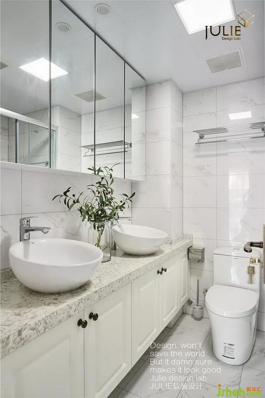 整體明朗清爽,簡(jiǎn)約衛(wèi)浴柜鏡為空間增加儲(chǔ)物功能。