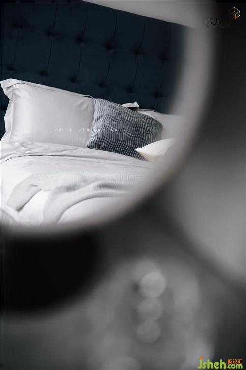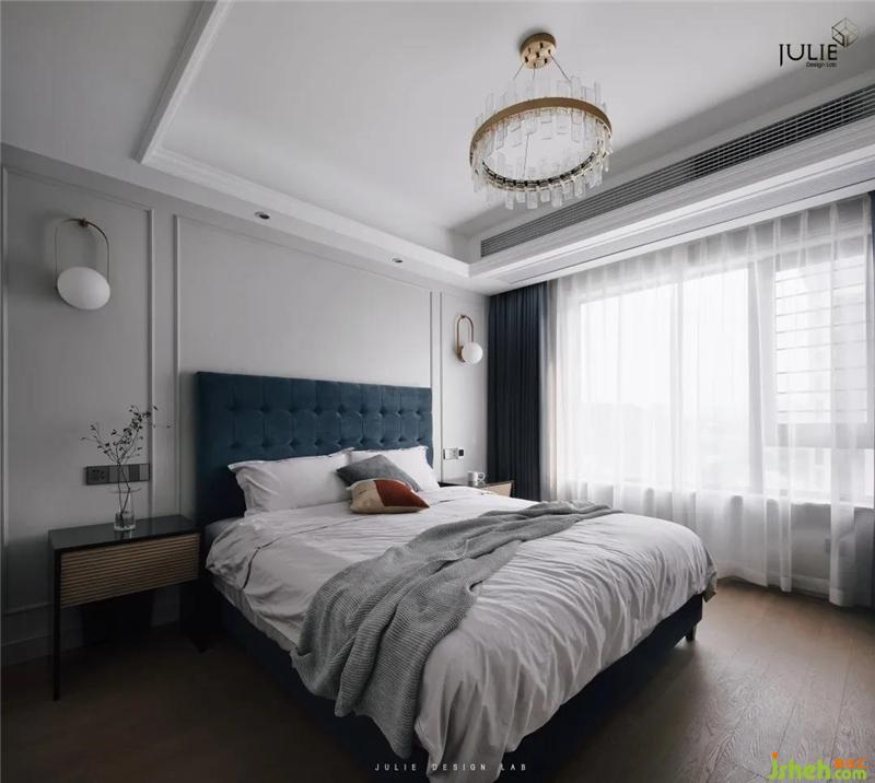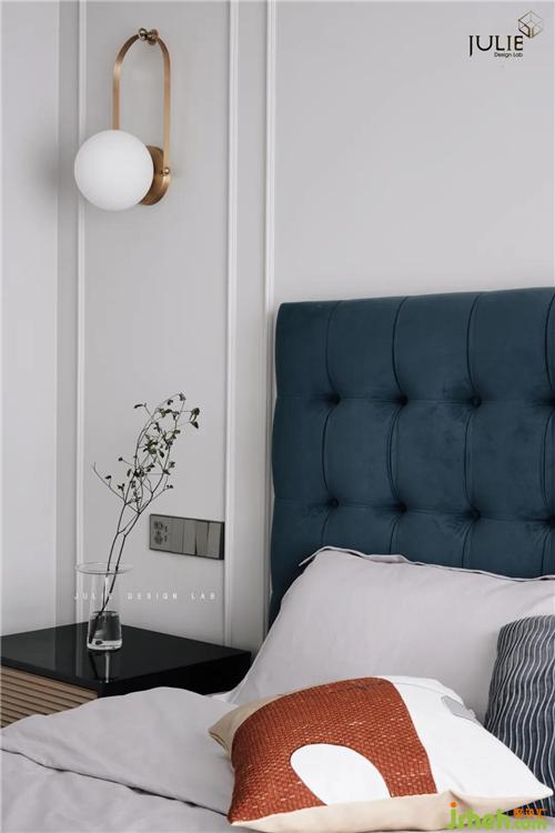 The wall of the master bedroom is decorated with simple lines, and then the bed with haze blue fills the whole space. The artistic style is just right and the space is exquisite. In the night, two exquisite and small wall lamps will be lit, slowly reshaping the tenderness of the space.