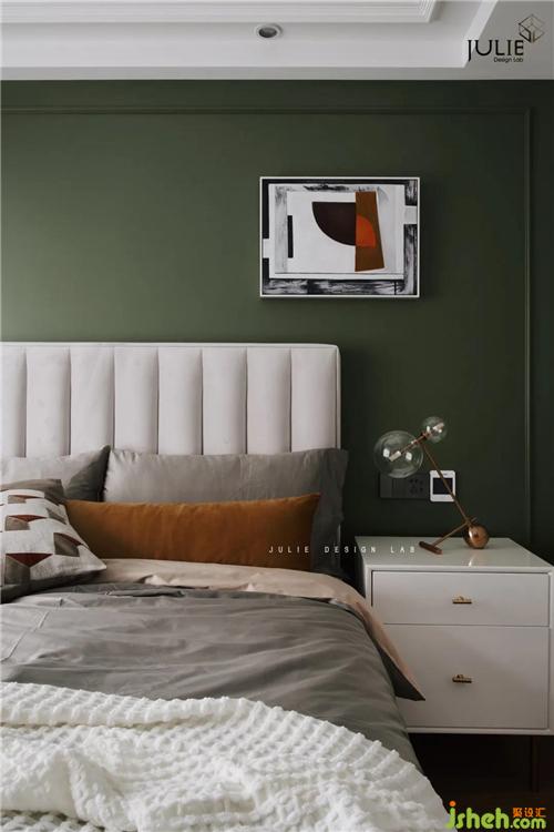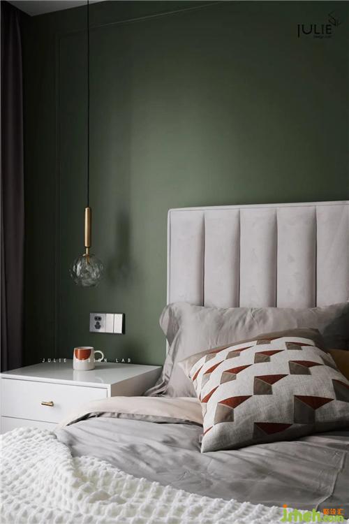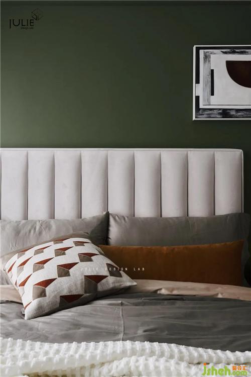 次臥回歸質(zhì)樸文藝的復(fù)古基調(diào),用牛油果綠打造一個(gè)舒適放松的睡眠空間。米灰色條紋床點(diǎn)綴焦糖色床品,加上床頭有趣的復(fù)古臺(tái)燈,充分體現(xiàn)細(xì)節(jié)的精致。