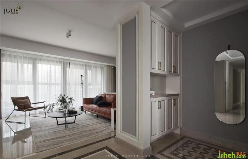 焦糖色皮沙發(fā)搭配灰色圈絨羊毛地毯。杭州裝修設(shè)計(jì)藝術(shù)小人像被安置在吧臺旁的臺面上、簡單卻有點(diǎn)晴的效果。