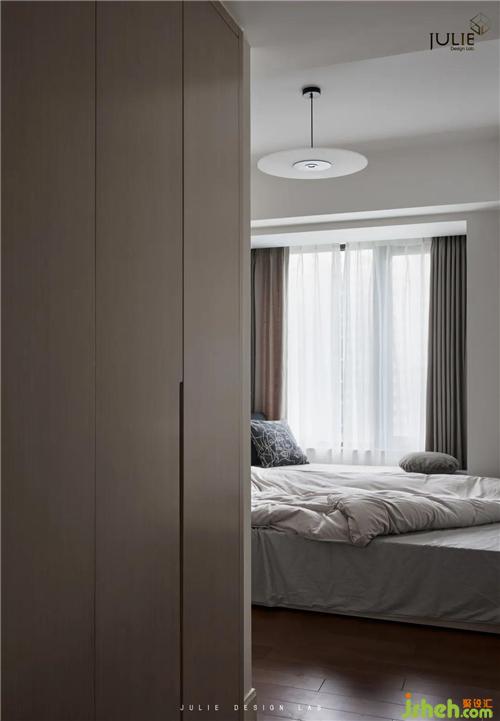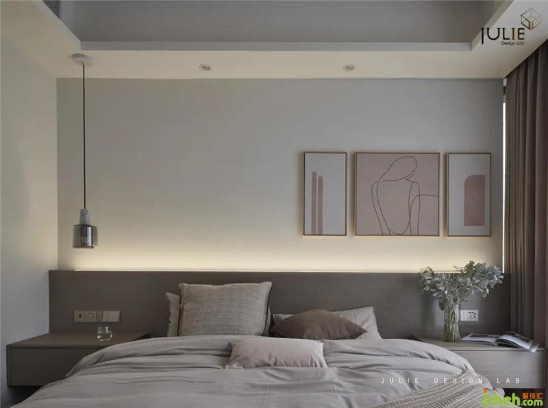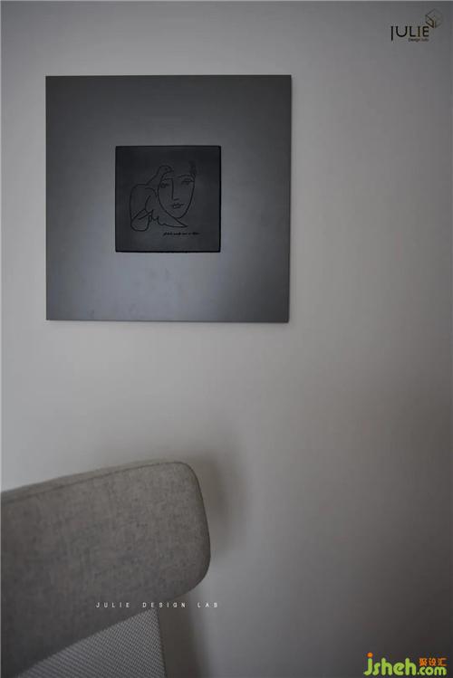 主臥作為一個(gè)家格調(diào)的基墊,人像與極簡(jiǎn)線條組合的掛畫(huà)與氛圍吊燈的結(jié)合也增加了休憩空間的品質(zhì)感。