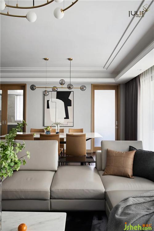 客廳空間大面積運(yùn)用了柔和的米灰色,在細(xì)節(jié)處則有優(yōu)雅的橘黃色與散發(fā)迷人魅力的金屬線條提升空間氣質(zhì)。