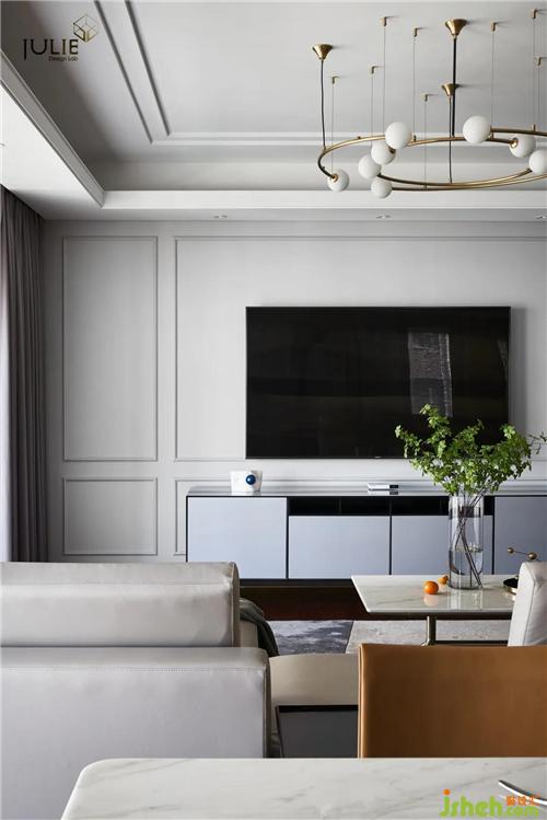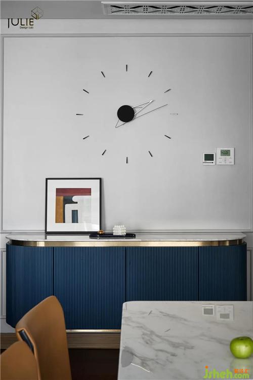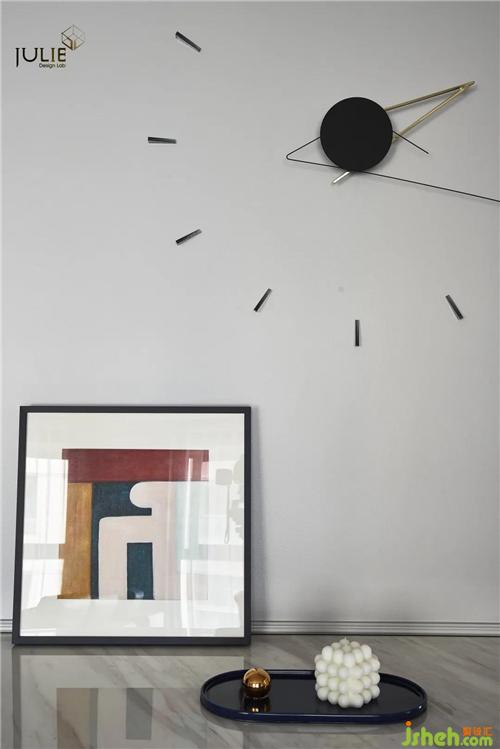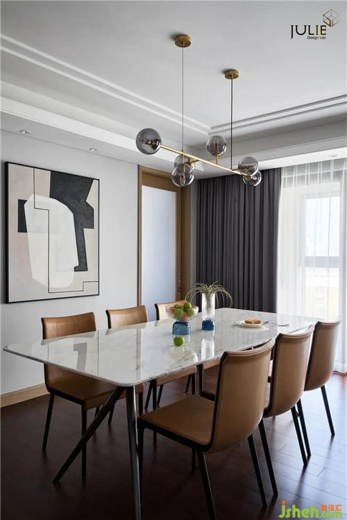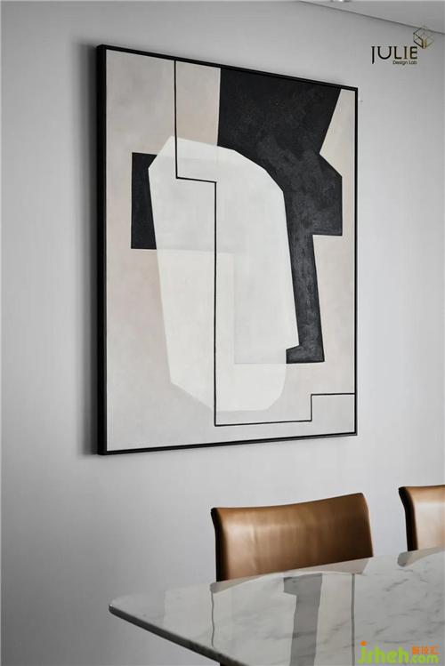 從墻面簡約幾何掛畫到餐廳懸空的幾根金屬基架的燈飾再到線條流暢的餐桌,節(jié)奏被帶得行云流水,沒有一絲的累贅。