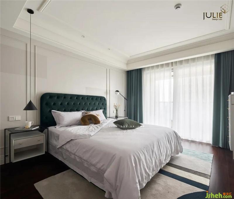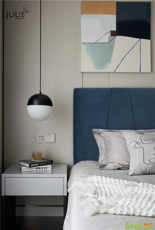 簡約的拼色線條壁畫搭配霧霾藍(lán)的床