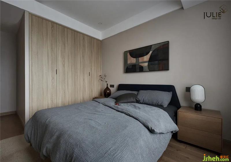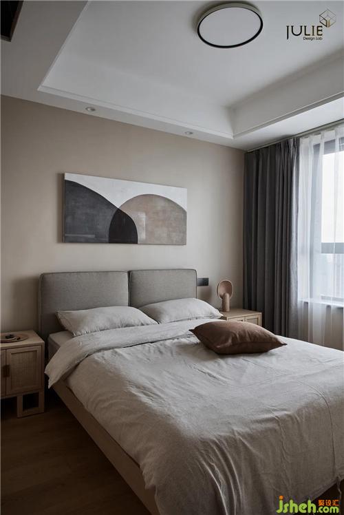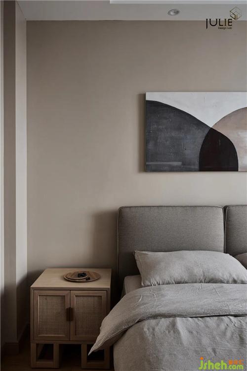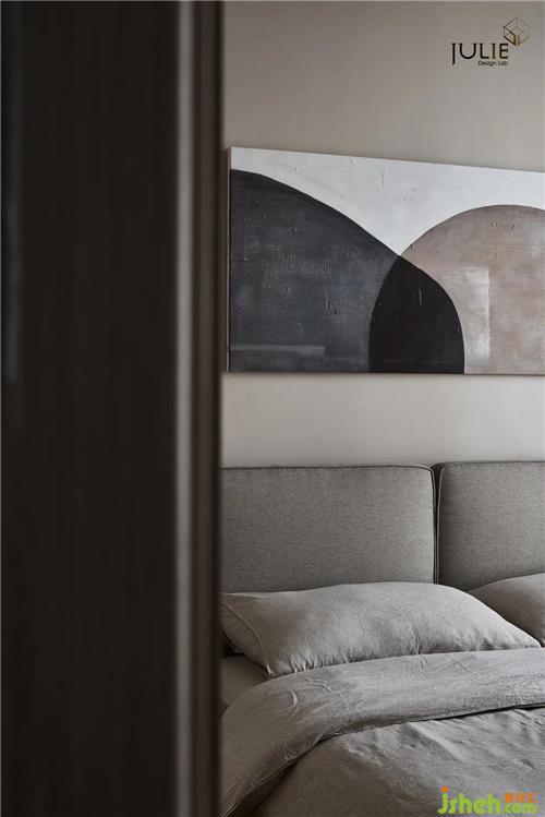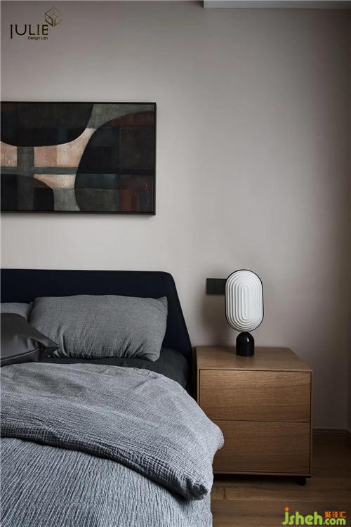次臥空間依舊是回歸質(zhì)樸,簡(jiǎn)凈的意象掛畫(huà)與棉麻的床品相融,清透的玻璃透著微爍的光,使天然的紋理和材質(zhì)呈現(xiàn)出的質(zhì)感美。