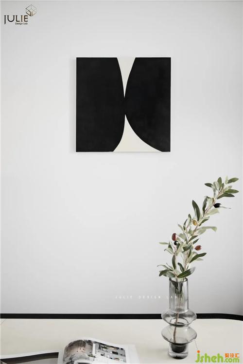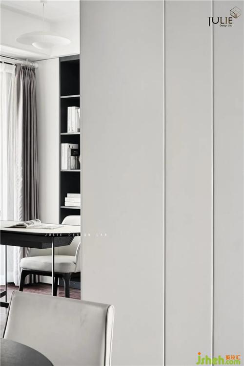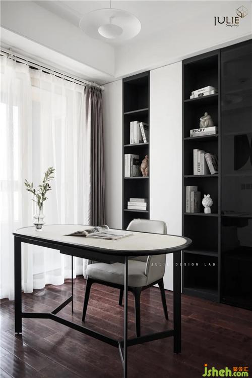 書房承擔(dān)閱讀和收藏功能,當(dāng)代藝術(shù)被融入的飾品、掛畫、家具細(xì)節(jié)等各處,通過各種樣式的組合搭配,形成強(qiáng)烈的視覺符號和空間印跡。