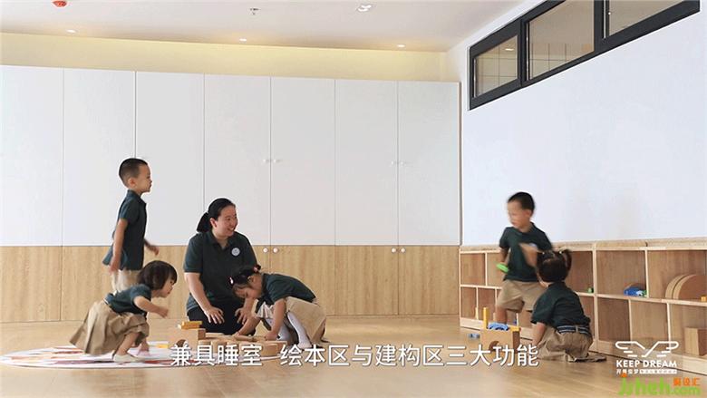 平時(shí)是建構(gòu)區(qū)、課間是繪本區(qū)、午休時(shí)拉上窗簾形成榻榻米睡室,后邊整面墻收納柜和睡被柜一體,方便孩子和老師拿取,培養(yǎng)孩子的自主性。