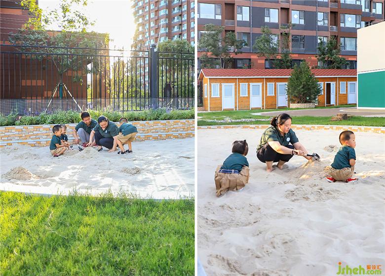 幼兒園設(shè)計(jì)園所戶外設(shè)置了“沙池”,午后暖洋洋的陽光下,老師帶著孩子感受自然的美好。