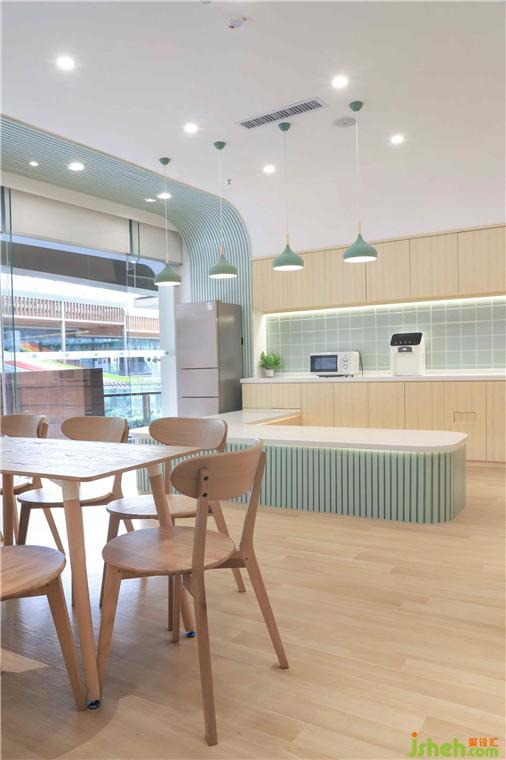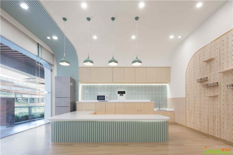 為孩子設(shè)計的廚藝教室,特意設(shè)置符合老師、孩子身高的高低臺,方便老師、孩子操作。吊柜和儲物柜幫助老師收納物品,保持空間整潔與干凈。