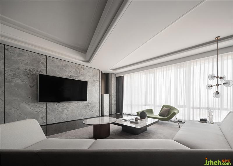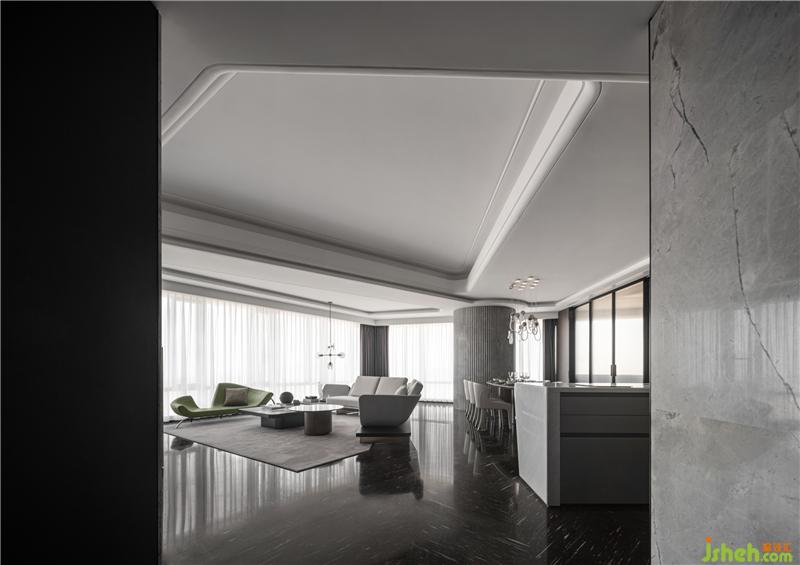 卡納設計將靈感放眼于自然景觀,山川與湖海是自然最偉大的造物,他們均帶有渾然天成的有機弧線,從中提煉線條與氣魄,為空間造就剛與柔并濟的輪廓,與有波浪造型的建筑的外立面形成呼應,青島樣板房設計借助大面積的景觀優(yōu)勢以打造“姿態(tài)優(yōu)雅的景觀豪宅”作為設計的切入點,將室內、建筑與景觀融會貫通,也把海天中心的品牌文化做進一步的延伸。