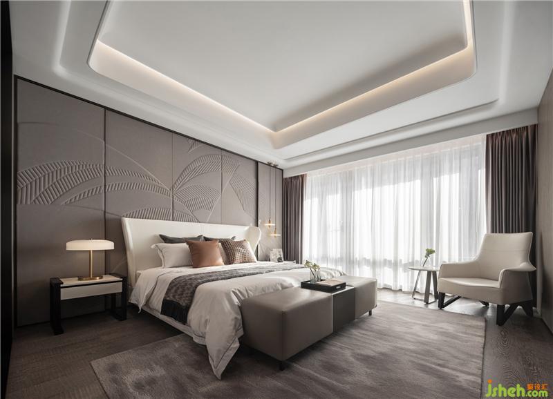 整個(gè)項(xiàng)目除了將山、水元素作為靈感,還將游艇內(nèi)飾的線條注入三間臥房,主臥更是以皮雕工藝將海浪的形態(tài)抽象化展現(xiàn)于背景墻之上,深邃的質(zhì)感與雅致灰色形成極強(qiáng)的張力,青島樣板房設(shè)計(jì)讓居住氛圍充滿低調(diào)奢華的氣質(zhì)。三間臥房中有兩間為套房的形式,將空間利用率發(fā)揮到極致。